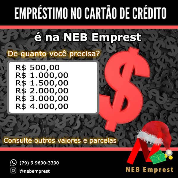Quer um empréstimo mais não é aprovado, venha para NEB Emprest, onde você pega empréstimo utilizando o seu Cartão de Crédito, não se engane com aparências e propagandas enganosas, aqui em Sergipe, empréstimo no cartão de crédito e dinheiro no bolso somente na NEB Emprest.
